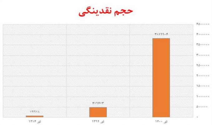 نگاهی دقیقتر به حجم نقدینگی در دولتها حاکی از آن است که حجم نقدینگی در تیر ۱۳۸۴، با روی کار آمدن دولت نهم، ۷۲۹۷۸ هزار میلیارد تومان بود و در پایان کار دولت دهم در تیر ۱۳۹۲ به ۴۷۹۶۷۳ هزار میلیارد تومان رسید. در ابتدای روی کار آمدن دولت تدبیر و امید، حسن روحانی و تیم اقتصادی وی، افزایش نقدینگی در دولت نهم و دهم را مورد نقد قرار میدادند. با این حال اما عملکرد ضعیف دولت یازدهم و دوازدهم در حوزه اقتصادی موجب شد تا حجم نقدینگی در تیر ۱۴۰۰ به ۳۸۱۹۹۰۴ هزار میلیارد تومان رسیده و اقتصاد کشور، بالاترین رشد نقدینگی سالانه را پس از انقلاب اسلامی تجربه کند.