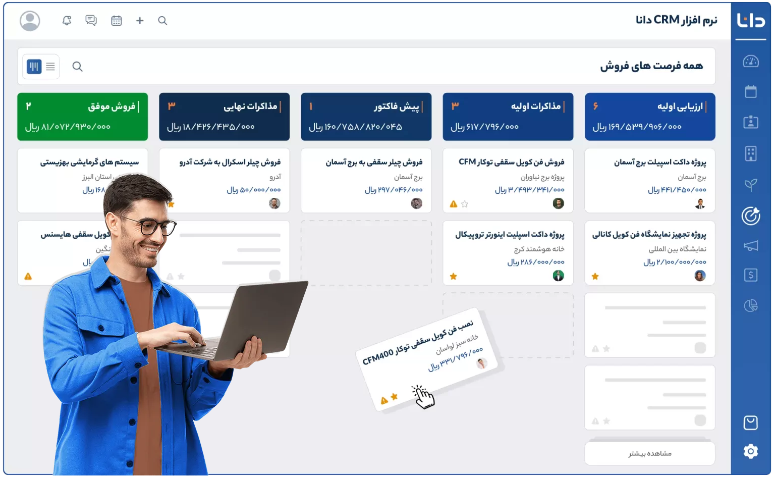 نرم افزار CRM دانا با قابلیتهای پیشرفته و ارائه بهروشها و راهکارهای کاربردی به سازمانها کمک میکند تا تجربه بهتری به مشتریها ارائه دهند و همکاریهای داخل سازمان ارتقا پیدا کند. و اینها همه در نهایت به تیم فروش کمک میکنند فروشی بیشتر داشته باشند و درآمد سازمان بالا برود.